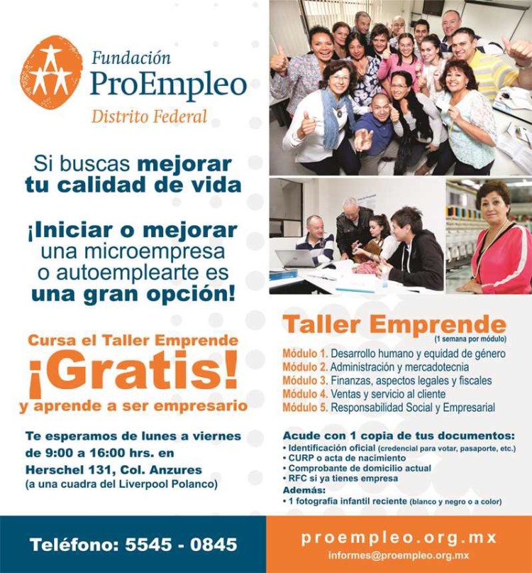 Cursa el Taller Emprende ¡Gratis! Sólo tienes que acudir a las oficinas de ProEmpleo, en la colonia Anzures, con los documentos que te solicitan.